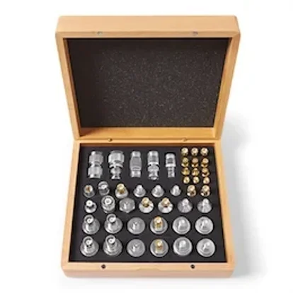 The TBCAS1 coaxial adapter set contains 44 pieces of the most common 50 Ohm coaxial adapters in a beech wood box.