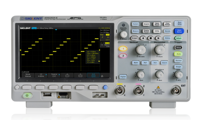 SIGLENT's SDS2352X-E Super Phosphor Oscilloscope with a 350 MHz bandwidth. Has a maximum sampling rate of 2 GSa/s and a standard record length of 28 Mpts. The most commonly used functions can be accessed with its user-friendly one-button design.