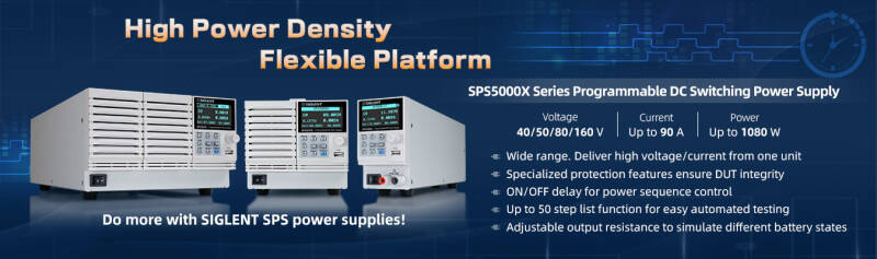 The Siglent SPS5161X is a single channel programmable Switching DC Power supply that provides a 0-160V 0-7.5A range with a max output power of 360W. The SPS5000X series is a ideal choice for a variety of demanding markets, including Commercial Industrial, Education, Energy and Power Generation, laboratory general testing, the LED lighting industry, and automotive electronics.