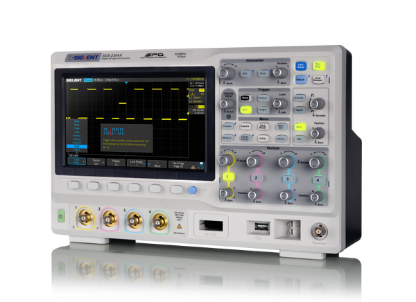 The SDS2304X series employs a new generation of SPO technology. It has an innovative digital trigger system with high sensitivity and low jitter, and a maximum waveform capture rate of 140,000 wfm/s (normal mode), up to 500,000 wfm/s (sequence mode). It also employs a 256-level intensity grading display with a color temperature mode to help visualize issues quickly. The trigger system supports triggering modes including serial bus and video triggering. The SDS2304X also features a history waveform recording and sequence acquisition for recording and replaying multiple trigger events. Other features include an impressive array of measurement and math capabilities, options for a built-in 25 MHz arbitrary waveform generator, 16 digital channels (MSO), and serial decoding.