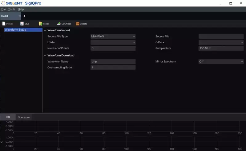 The Custom IQ option allows users to import externally generated I/Q data files, created using tools such as MATLAB®, Python, or other signal-processing software. These waveforms can then be converted to RF signals directly by the signal generator, ensuring precise and repeatable playback.