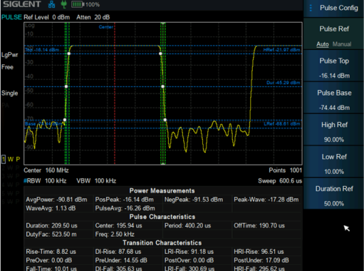 The Siglent SHA860-PU option enables the advanced pulse profile analysis for accurate characterization of pulsed RF signals.