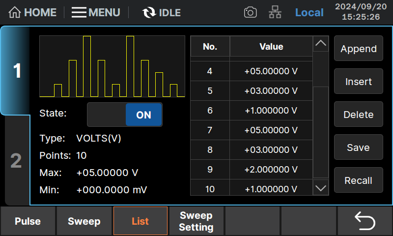 List Mode enables custom output sequences with a 10 μs minimum interval. Users can program linear, non-linear, arbitrary, or fully customized steps while the instrument sources voltage or current and simultaneously measures and logs data—ideal for transient testing and multi-step stress profiling.