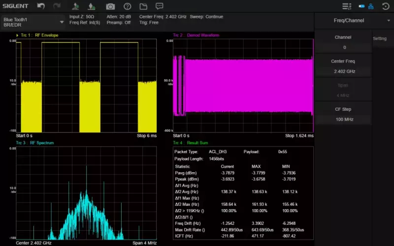Bluetooth is widely used in various devices and application scenarios as a wireless communication technology. The measurement application follows the Bluetooth® RF test specification issued by Bluetooth SIG to calculate the measurement results, and automatically detects the protocol version of the signal for Bluetooth BR/EDR/LE with one-click measurements to help you design, evaluate and manufacture Bluetooth devices with confidence. Together with the new SigIQPro signal generation software and a SSG5000X-V generator, it forms an economical and efficient SIGLENT Bluetooth signal generation and signal analysis solution, accelerating the process from signal generation to data to evaluation. The SSA5000A is helpful for users to troubleshoot flexibly in the laboratory and optimize RF design easily and quickly.