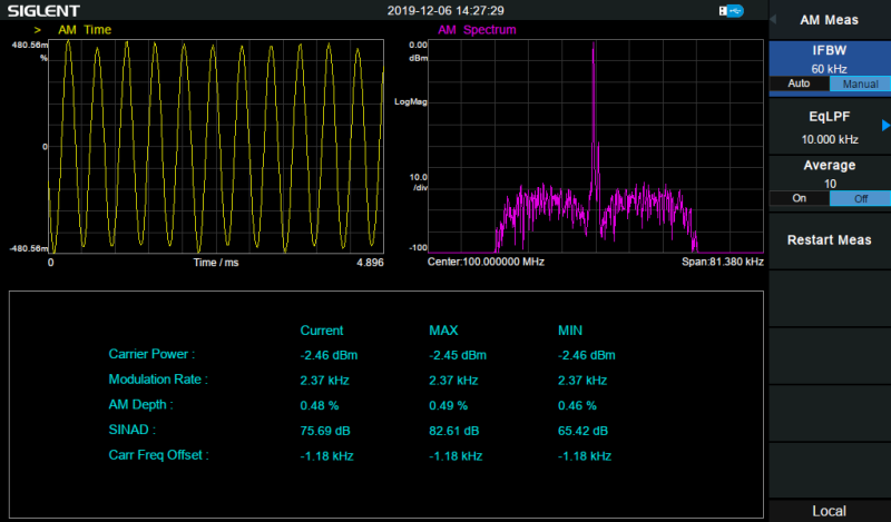 A stable frequency source is a common need for many electronic devices and most RF equipment. Phase noise can be used to characterize the short-term frequency stability of these frequency sources. Siglent’s SSA5000A Spectrum analyzers now provide a one-button phase noise measurement. The SSA5000A features lower Display Average Noise Level (DANL) and phase noise ensuring the accuracy of your tests. The smaller resolution bandwidth avoids measuring both carrier power and noise power together, and the measurement results are automatically calculated and graphed. The use of a logarithmic scale for the horizontal coordinate gives both a wider frequency range and finer resolution when close to the carrier – smaller offsets tend to reflect the quality of the signal better than phase noise at larger frequency offsets.