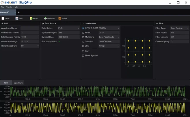- Custom IQ and Custom OFDM, including Digital modulation, Custom modulation, Multitone and LFM sweep
